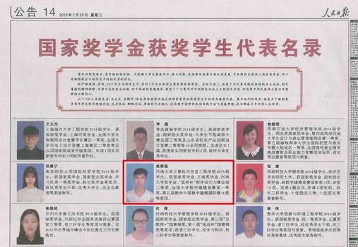 2018年2月28日,《人民日报》14版刊登了2017年度高等学校国家奖学金获奖学生代表名录,其中大赢家足球比分