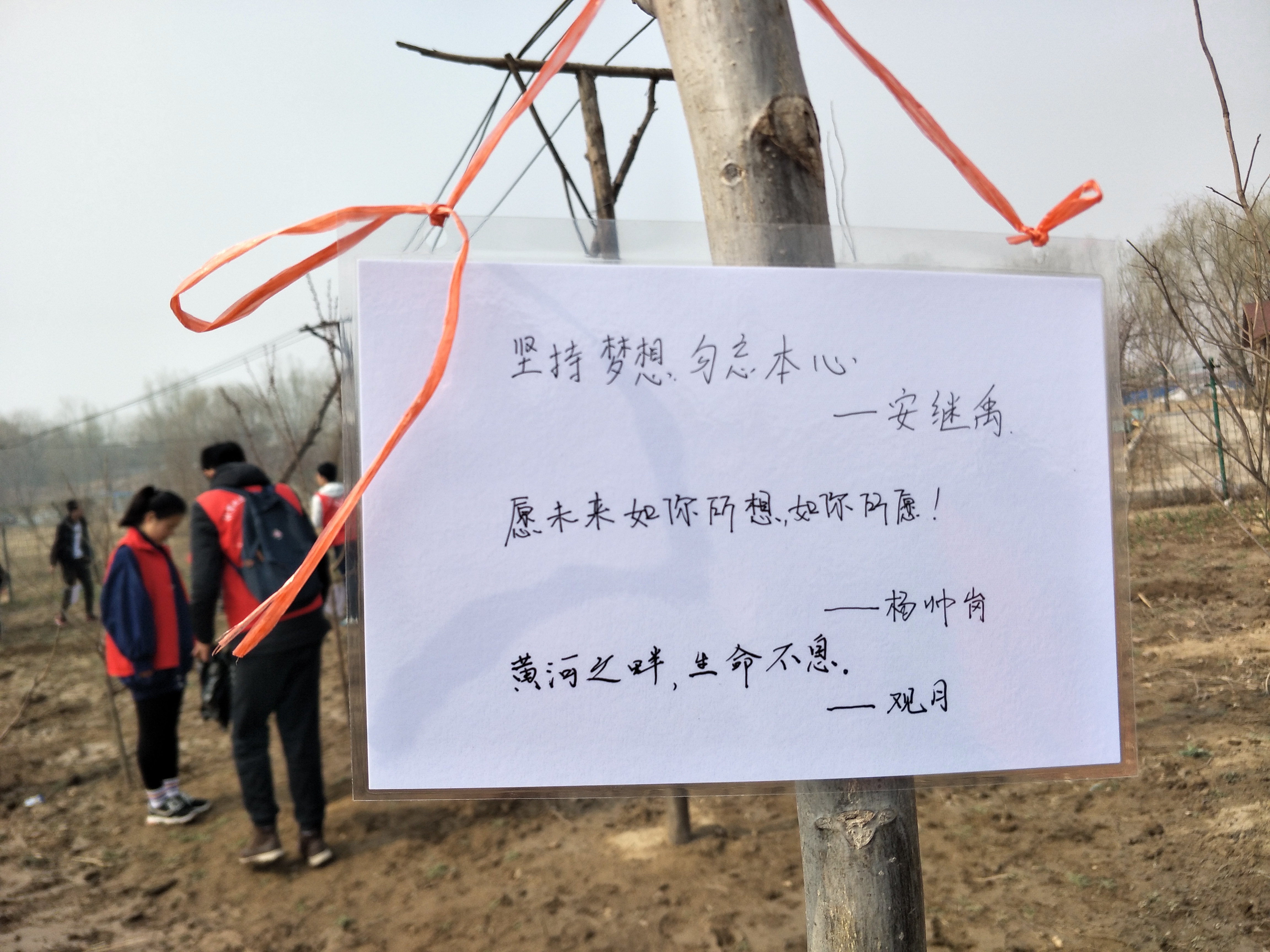 黄河畔,天朗气清,凛冬寒意已全然退去。各位志愿者在泥泞的土地上挥汗如雨。有挖坑的、有扶树的、有搬树的、有在树上挂上附带自己心意的牌子的,各位志愿者都在为地球多一份绿色,献出自己的一份力量。