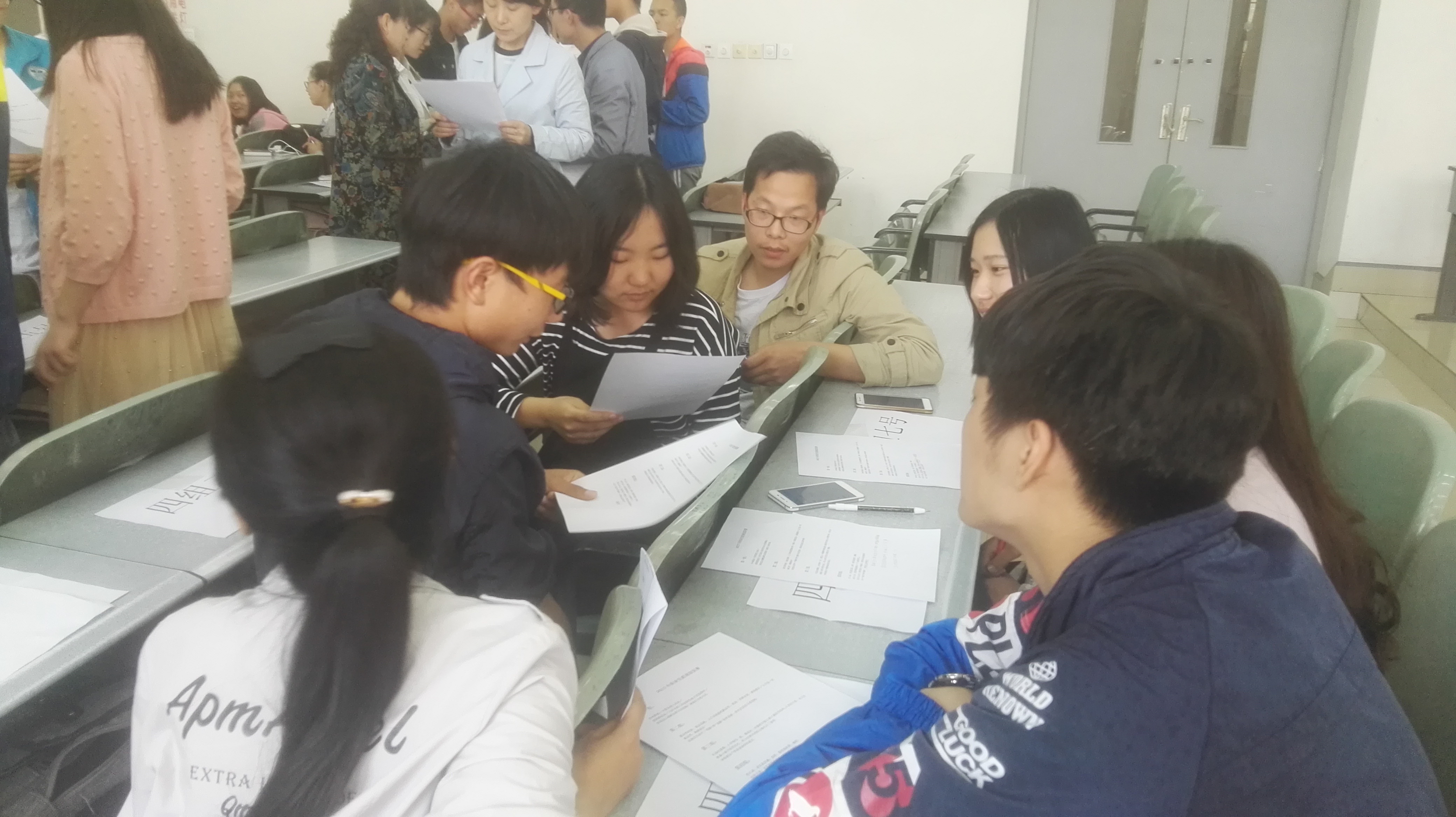 个人展示结束后,各小组就评委给出的问题讨论大概10分钟的时间。在这期间,评委老师们会下台随机询问各小组讨论的情况并提出一些问题。评委们给出的论题紧紧围绕着“职业生涯规划”这个主题,具有时代特点和创新观念。有关于人生的思考、最向往的生活、弯路和直路的辩证以及老实与聪明的辩证讨论等等。这些问题更好地激发了选手们的思考:我们应该怎么做才能更好的立足于社会?我们需要什么样的品质?我们的人生观到底是怎样的呢?这都值得我们去深思。讨论结束后,每组各派两名代表上台总结。