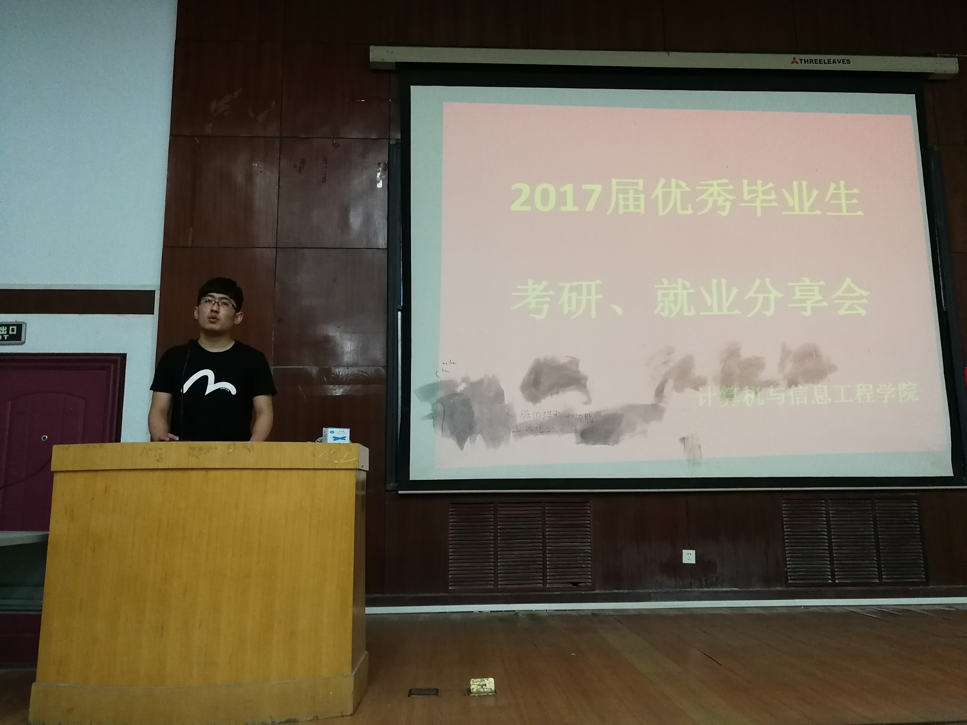接着,王昊学长上台发言。他阐述了自己选择的三个方向:考研,培训和实习,并且分析了各个方向的优缺点,劝诫我们要努力学习,明确自己的方向。