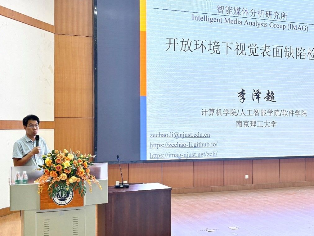 报告会上,李泽超首先阐述了图像视频大数据智能分析与识别在工业生产、瑕疵检测等实际应用中的关键作用。围绕开放环境下视觉异常检测问题,他重点介绍了面向视觉异常检测的预训练模型知识增强方法,探讨了如何有效挖掘模型知识以实现预训练模型与下游异常检测任务的高效适配。随后,李泽超详细讲解了其团队提出的通道-空间串联分析的语义分割模型,以及基于特征蒸馏学习、分区记忆机制、自监督分割引导和非对称蒸馏分割等一系列创新异常检测方法。最后,结合相关实际案例,报告会展示了上述技术在工业质检等场景中的应用成效。