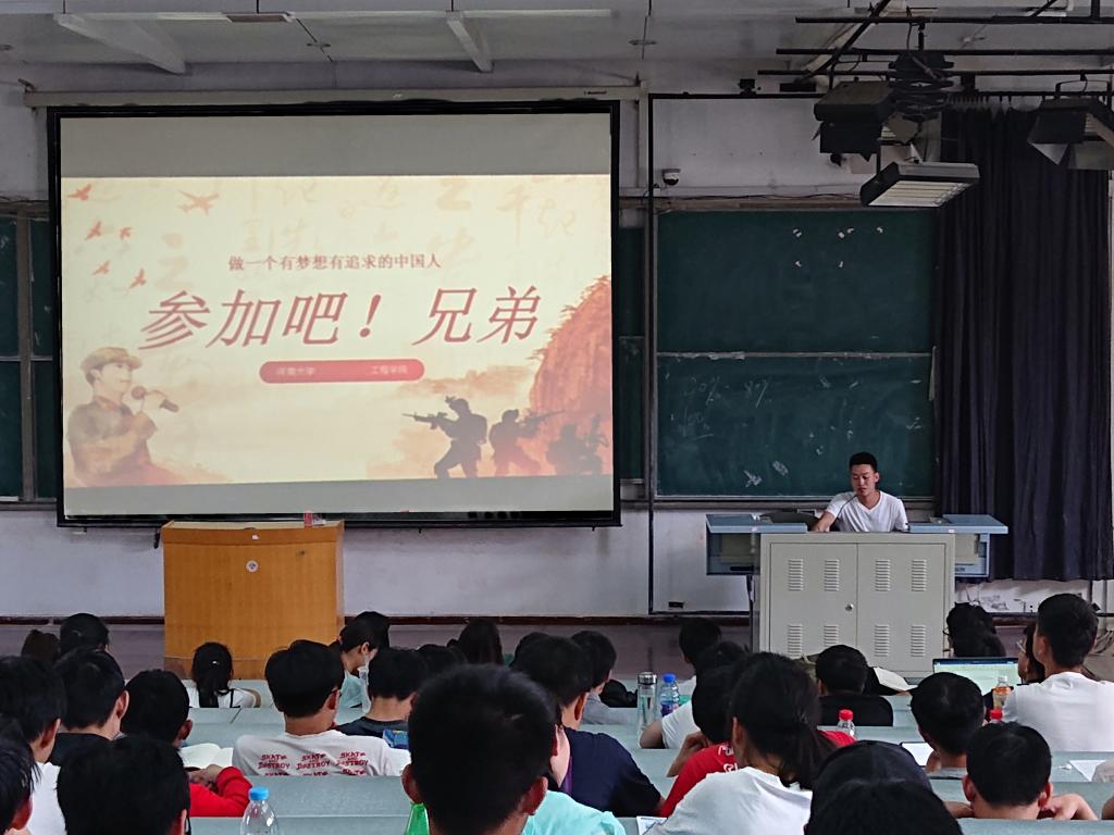 2017级会议上,辅导员程前帅老师根据《河南省大学生征兵工作会议》和《河南大学2019年大学生入五征集工作方案》,从应征入伍基本条件、报名流程以及大学生入伍可享受的优待政策等几方面入手,并播放了2019年征兵工作宣传片,使同学们全面了解了大学生征兵工作。随后,2015级退役复学的陈孙坊同学结合切身经历和感受,给同学们分享了军营生活的方方面面,起到积极动员作用。