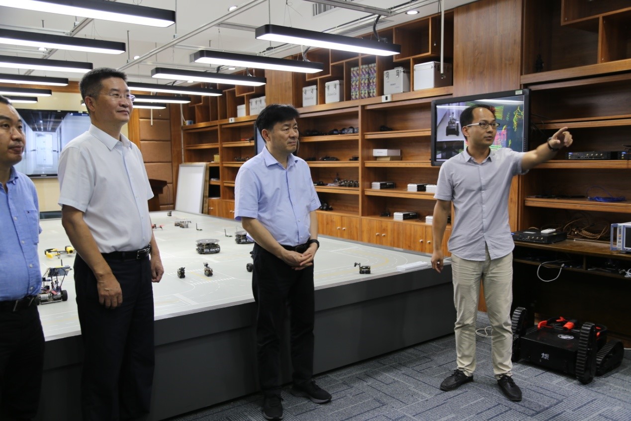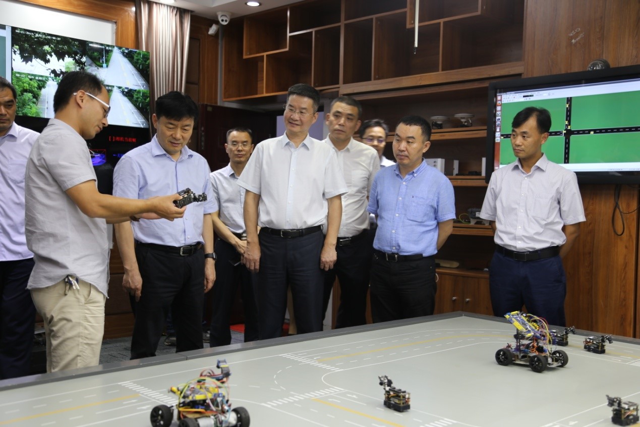 调研“5G+无人驾驶与车路协同基地”的建设情况,校党委常委、副校长刘先省和大赢家足球比分