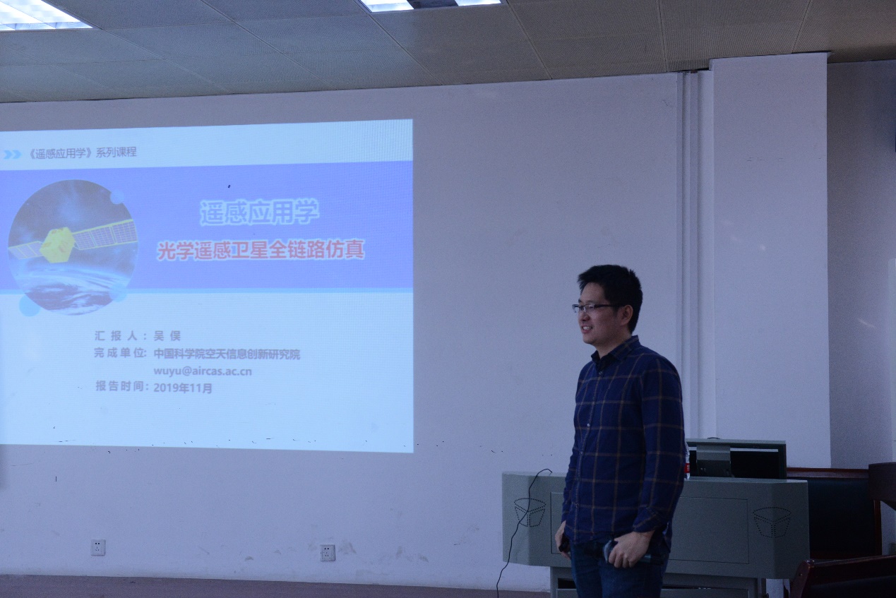 吴俣博士首先简单介绍了我国卫星遥感技术经过40年快速发展,已经广泛应用在社会生产与科研实践活动中,并逐渐形成以卫星遥感应用学的概念。遥感是有关“探测绘”地球的信息获取手段,遥感仿真可以看做是有关遥感信息的一种“绘”的方法,即利用所掌握的观测对象与遥感工具的知识,按照任务需要构建精细刻画遥感过程的仿真模型与数据集,实现对遥感过程的分析与问题的回答。然后介绍了卫星遥感技术与仿真技术的结合是航天遥感系统科学发展的自然结果,卫星遥感仿真技术可以为客观认识航天遥感系统数据特点与规律提供方法指导和技术工具,为降低航天遥感系统的设计和研制风险,促进航天遥感产品成熟度的快速提升和广泛应用提供有力支撑。最后,作为遥感应用学的重要方向,吴博士介绍了光学遥感卫星全链路仿真的目前现状、核心问题、关键技术及未来展望,旨在支持卫星遥感应用技术体系发展及基础设施建设模式优化,提升我国卫星遥感应用水平与能力。报告深入浅出,用日常生活中的例子将原本专业化的光学遥感卫星全链路仿真讲解地通俗易懂、生动有趣。报告在师生们热烈的掌声中结束。