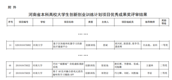 近日,河南省教育厅根据《关于印发河南省大学生创新创业训练计划管理办法的通知》(教高〔2019〕871号)和《关于大学生创新创业训练计划项目立项及结题的通知》对2020年大学生创新创业训练计划项目优秀成果的评审结果进行了公示。