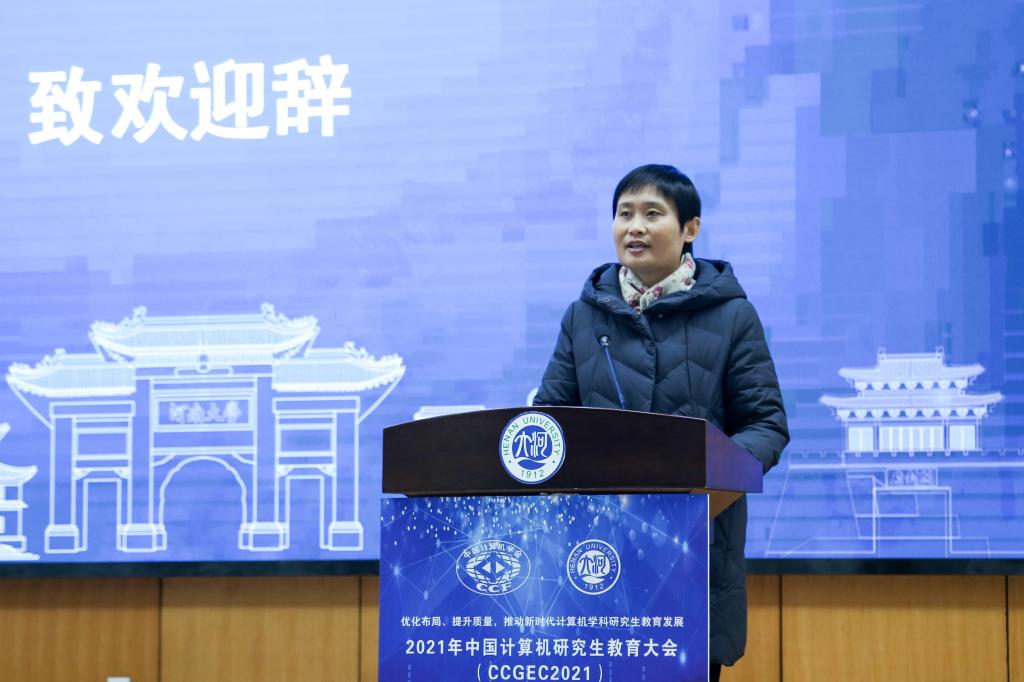 报告厅举行,由河南大学韩道军教授主持。2021年中国计算机研究生教育大会主席、吉林大学魏晓辉教授在致辞中表示,本次大会以习近平新时代中国特色社会主义思想为指导,以推动新时代计算机学科研究生教育发展为目的,克服了重重困难,最终在线上举办。他对承办单位和协办单位表达了诚挚的谢意,并预祝大会圆满成功。河南大学党委常委、副校长冯淑霞教授致欢迎辞,对长期以来对河南大学的关心支持的专家学者和嘉宾表示衷心感谢,介绍了河南大学办学发展史和河南大学计算机研究生教育的基本情况。她指出,研究生教育是国民教育的重要组成部分,是教育强国建设的引擎,在培养高层次创新人才方面具有重要意义,本次大会的召开为高等院校、科研院所、高新企业等多方参与的交流与合作搭建了平台,对促进我国计算机研究教育的发展具有现实意义。