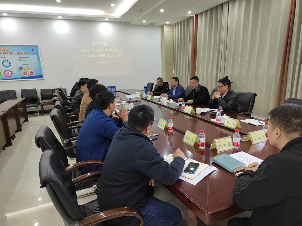 党委书记吕冰带队到中国电信股份有限公司开封公司(开封电信)与来汴调研的河南电信教育客户部总经理张旻等一行4人举行项目对接合作交流。跟随吕冰参加座谈的有副院长柯杨、副院长左宪禹、信息安全系党支部书记张磊、数据智能分析与处理团队负责人朱小柯;跟随张旻来汴调研的有河南电信政企支撑中心副总经理康浩杰、教育专家张爱军、徐丙卫;开封电信参加座谈的有开封电信总经理助理胡鑫,教客部总经理黄春雨、政企支撑中心总经理孙国栋、云网部5G专家高翔、云网部计算机专家安永辉。