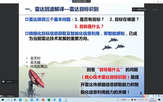 本次报告针对雷达目标回波对于载频、带宽、重复频率、驻留时间等雷达参数以及观测视角的依赖性而导致的数据驱动特征可迁移性差的问题,提出了包括微动特征提取、典型散射体特征提取、典型部件分割和真实几何尺寸反演等解决方案和策略,基于大量仿真和外场实测数据的试验验证及其定量分析结果,证明了所提方法的有效性。在问答环节中,杜兰与参会师生进行了充分交流,详细解答了师生提出的问题并给予建议。