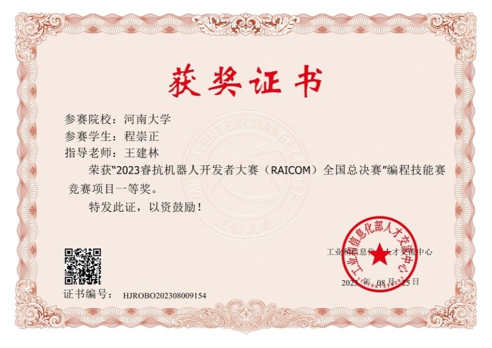 20级程崇正同学获得编程技能赛道一等奖。