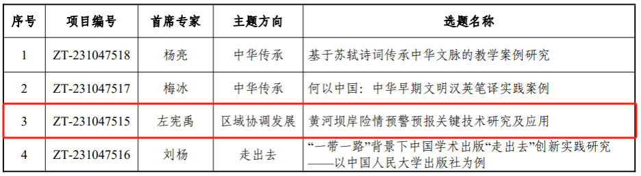 左宪禹教授担任首席专家的案例《黄河坝岸险情预警预报关键技术研究及应用》(项目编号:ZT-231047515)成功立项。该案例主要团队成员还包括大赢家足球比分
