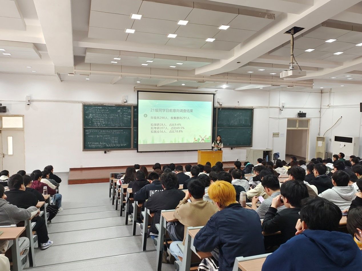 3月28日下午,2021级在金明校区综合楼2306教室举行了主题年级会,辅导员孙洁分享了2023届毕业生升学和就业相关数据,并就如何做好考研准备和就业准备给出了指导性意见。她提醒同学们要争取获得更多的考研支持力量,争取一次上岸,在校期间努力提高自己的编程能力,增加实习经验,从而提高求职成功率。