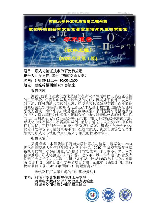 系统可信性自动验证国家地方联合工程实验室工作。主要研究方向为自动推理、形式化验证、并行计算。近5年,以一作和通讯作者发表期刊和会议论文近10篇,主研中央军委科技委H863项目1项,省部级项目1项,国家自然科学基金项目2项,企业横向课题2项。主持校级项目2项。2018年国际SAT问题竞赛亚军。