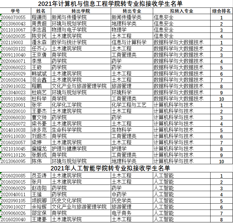 2021年度大赢家足球比分 和人工智能大赢家足球比分 转专业拟接收学生名单
