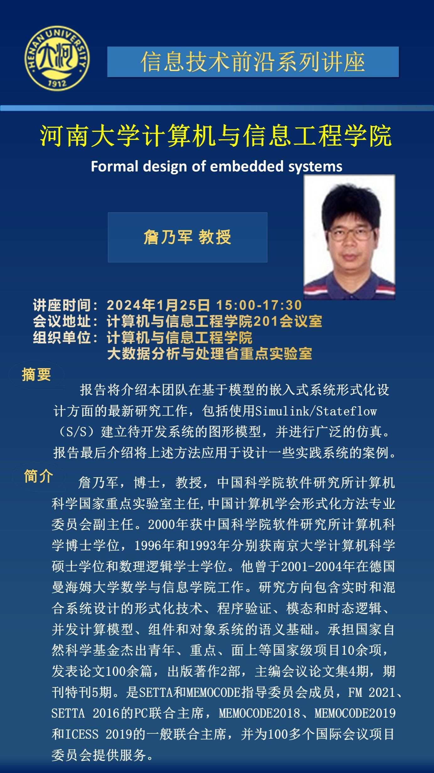 詹乃军:Formal design of embedded systems(时间:1月25日)
