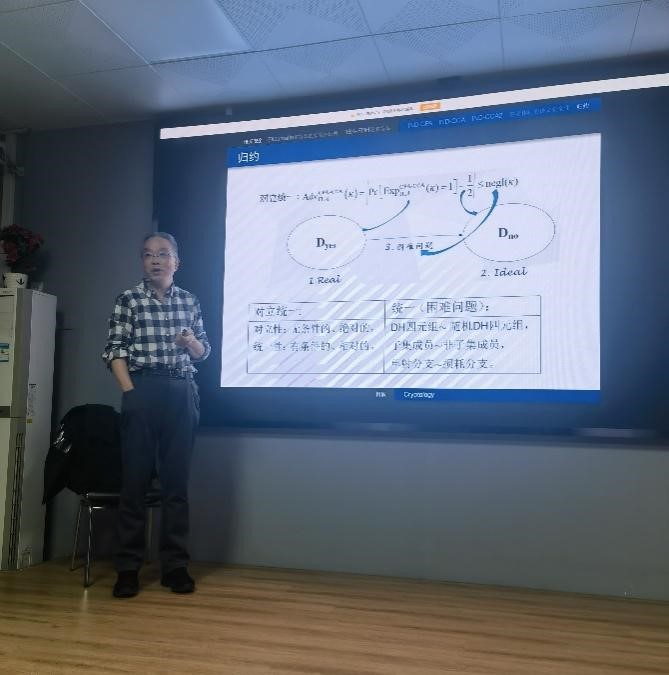 报告会上,杨波教授首先介绍可证明安全密码体制的概念,包括选择明文安全的密码体制、选择密文安全的密码体制、适应性选择密文安全的密码体制以及选择消息攻击下的存在性不可伪造的签名方案。然后介绍安全性证明中的规约方法。从不同角度,逐层输入,细致耐心的为师生讲解密码学中的可证明安全。报告会的最后,杨波教授对师生提出的问题进行详细回答,解决了他们心中的困惑。
