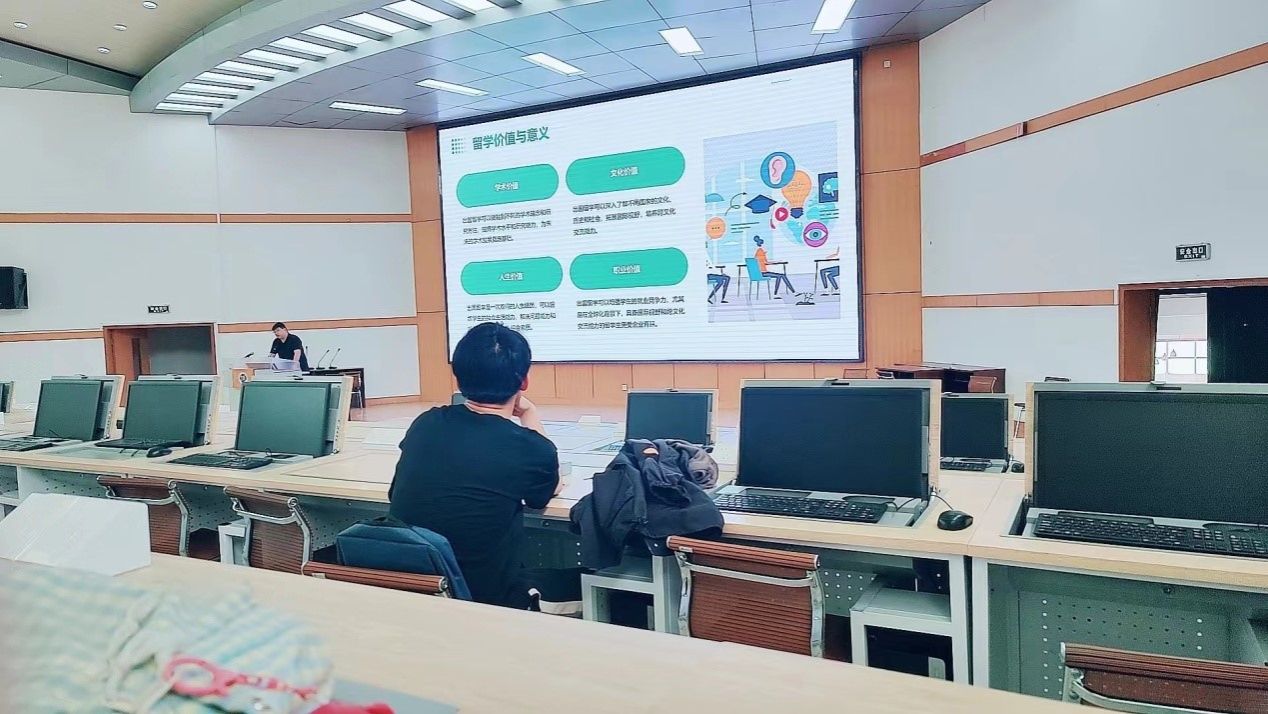 2024511日上午,大赢家足球比分 郑泰皓老师在大赢家足球比分 201会议室,为大赢家足球比分 学生做出国留学经验分享交流报告。
