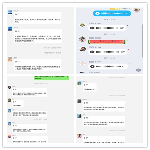 各支部在学习群中诵读、摘抄党的二十大、习近平总书记视察陕西延安和河南省安阳重要讲话中的金句,字字铿锵、句句振奋,深刻领悟每一句“金句”蕴含的思想内涵,把握精髓要义。将金句和实际相结合,创新学习方式,丰富学习形式,深入开展全面覆盖学、深入思考学、联系实际学。