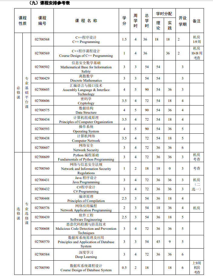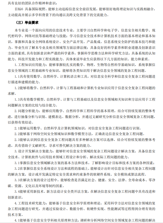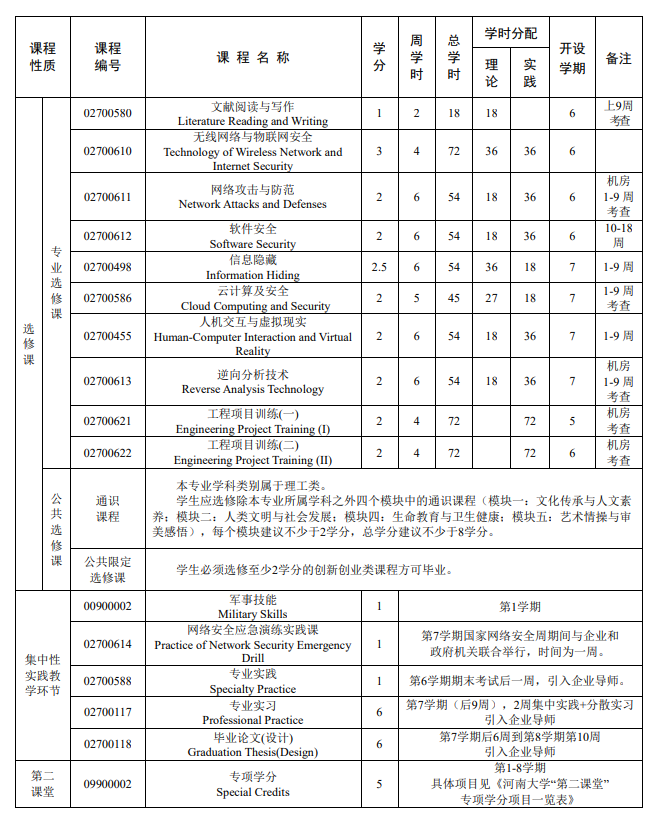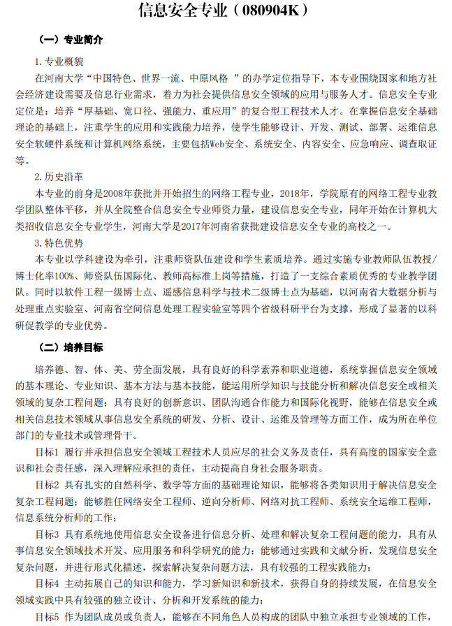 河南大学信息安全专业的前身是2011年获批并开始招生的网络工程专业, 2017年获批信息安全专业,2018年开始招生,河南大学为河南省首批建设信息安全专业的院校。信息安全系于2020年获批河南省信息安全科普教育基地,并成立开封市信息安全专家智库,强化高校教师建言献策的作用,对发生的网络安全应急事件提供处置参考意见,并对安全意识、保密意识、服务意识、沟通能力等多方面的提供技术支撑。2020年入选河南省一流本科专业建设点,2021年获批河南省新工科信息安全大学生实习实践基地,2022年信息安全党支部被评选为河南省样板党支部,2023年获批河南省全民数字素养与技能培训基地。经过4年的建设,信息安全专业已建立完善的人才培养体系,专职教师26人,其中博士26人,在读博士1人,教授6人,副教授12人,讲师8人。 具有副高级技术职称以上教师占总数的70%。