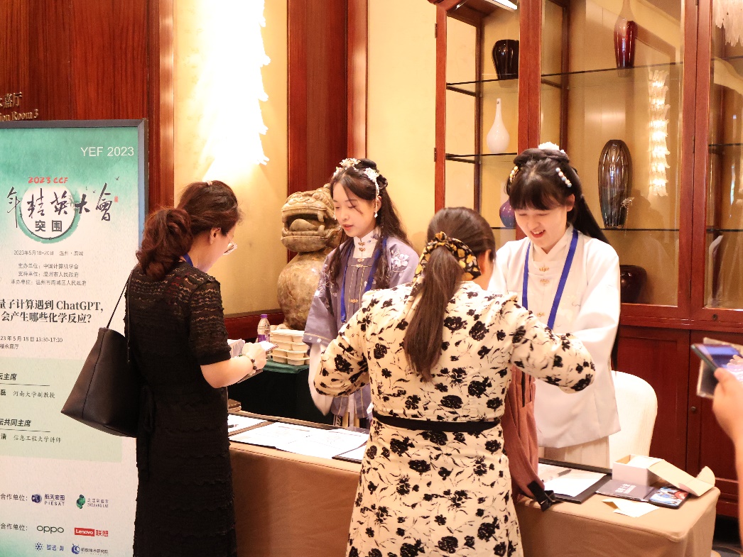 研究生赵一鸣、张若阳身着汉服,参与到CCF YOCSEF郑州分论坛组织的一场题为“当量子计算遇到ChatGPT,会产生哪些化学反应?”技术论坛的相关工作中,展现中华优秀传统文化的活力,让汉服之美也进一步点燃我们的文化自信。