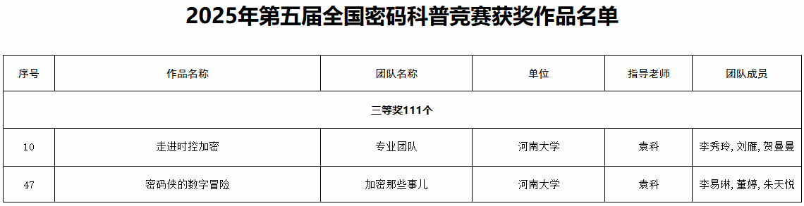 第五届全国密码科普竞赛由国家密码管理局指导、中国密码学会主办,以“知密码、懂密码、用密码”为主题,共吸引全国347支团队、318件作品参赛。经过网络初评、专家与大众联合评审,最终147件作品脱颖而出,河南大学代表队以通俗易懂的动画短片形式,向公众展示并宣传了密码的原理和意义,赢得评委一致好评。