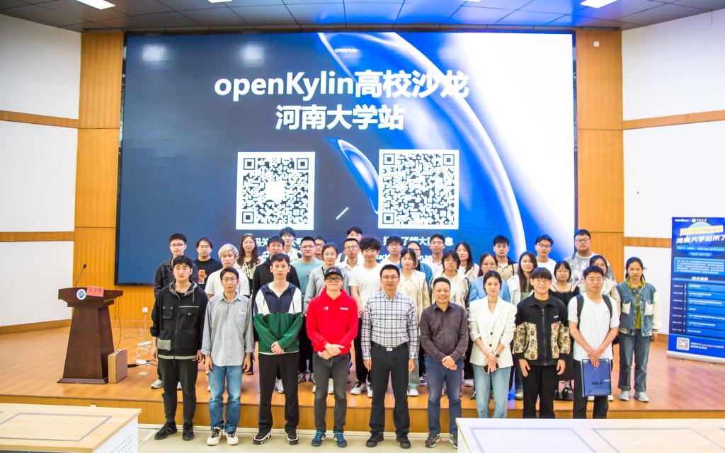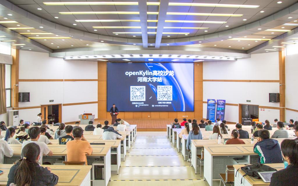 向到场嘉宾来到河南大学表示欢迎,并向与会学生介绍了开源社区基本情况,并号召大家积极参与“麒麟杯”大赛,在实践中提升专业能力。余杰在活动致辞中,号召同学们重视基础研究,投身基础研究,为国家基础研究做出贡献。openKylin社区UKUI SIG Maintainer席博文带来《openKylin开源社区及生态建设实践》的主题分享。鉴释科技编译器工程师董一帆给现场的同学们介绍了基于Open64和LLVM的RISC-V高性能编译器Xcalcompile,同时分享了个人求学和实习经历,为同学们学习工作带来新的思考。随后鉴释科技创始人兼CEO梁宇宁向同学们展示了全球首款RISC-V开发笔记本电脑ROMA的相关设计与功能以及后续计划。数科网维软件开发工程师张国辉围绕《签章和打印控制组件开发使用》进行主题分享。