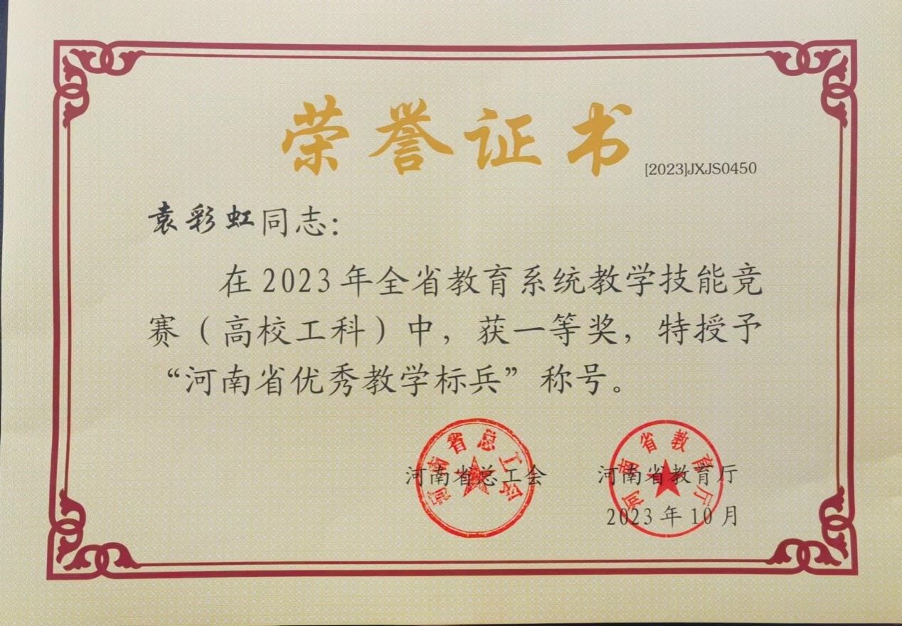教师袁彩虹老师获得一等奖,同时被授予“河南省优秀教学标兵”荣誉称号并获颁奖杯、奖章。